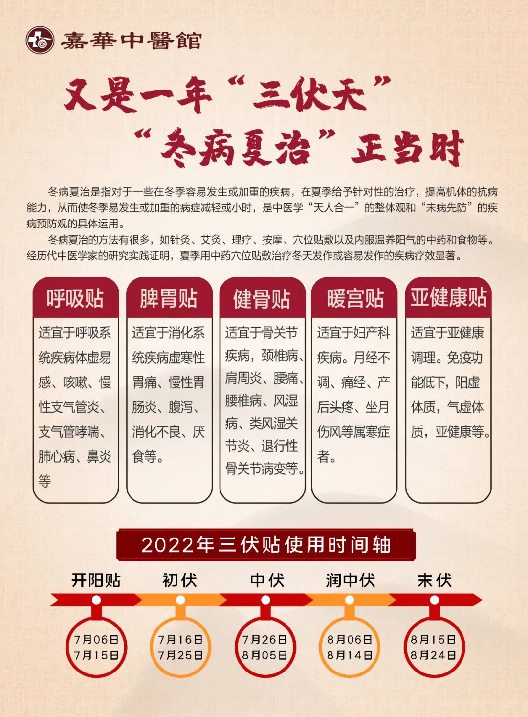 上海嘉华医院中医科将于2022年7月6日至8月24日期间,每日开展三伏贴穴位治疗,欢迎各路小伙伴前来体验!